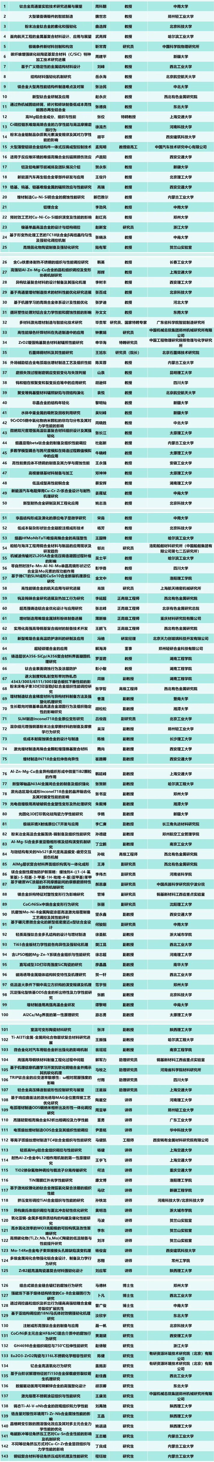 2025中國結構材料大會暨第十一屆全國有色金屬結構材料制備/加工及應用技術交流會 3月21-23日 河南鄭州>> 為進一步推動我國結構材料的學術繁榮、技術創新和產業發展,促進結構材料向高性能化、復合化、結構功能一體化發展,加強產、學、研、用深度融合,交流結構材料領域近年來具有創新性的科技及應用成果,由中南大學、鄭州輕工業大學、上海交通大學、鄭州大學、河南科技大學、陜西理工大學、北京科技大學、桂林理工大學、蘭州理工大學、新疆大學、內蒙古工業大學、昆明理工大學、太原理工大學、湖南工程學院、洛陽理工學院、南昌理工學院、佛山大學、中冶有色技術平臺、中國有色金屬智庫等單位將于2025年3月21-23日在河南省鄭州市,共同舉辦“2025中國結構材料大會暨第十一屆全國有色金屬結構材料制備/加工及應用技術交流會”。 本次會議旨在交流結構材料領域近年來具有創新性的科技成果、應用成果,著重對當前有色金屬輕合金材料、高性能銅合金材料、金屬基復合材料、難熔金屬材料、硬質合金材料、粉末冶金材料、先進鋼鐵材料、高溫合金材料、非晶及高熵合金、納米材料、無機材料、稀土、稀有金屬材料、金屬表面工程、增材制造、材料成型與連接、分析測試與模擬計算技術等相關材料的制備、加工、應用等多個環節和領域的科技與產業的熱點、重點、難點等問題展開研討,以促進我國結構材料領域新技術、新工藝和新產品的研究開發與推廣應用,推動我國結構材料的學術繁榮、學科發展、技術創新與產業進步。會議期間還將舉行第六屆中國結構材料院(所)長論壇。 本次會議將邀請國內結構材料領域的知名專家、學者和企業代表就國家相關政策和技術水平的發展做專題報告。歡迎相關高校、科研院所、企事業單位的科技人員等踴躍參會。 業務組織 一、主辦單位 中南大學 鄭州輕工業大學 上海交通大學 鄭州大學 河南科技大學 陜西理工大學 北京科技大學 桂林理工大學 蘭州理工大學 新疆大學 內蒙古工業大學 昆明理工大學 太原理工大學 湖南工程學院 洛陽理工學院 南昌理工學院 佛山大學 中冶有色技術平臺 中國有色金屬智庫 二、協辦單位 高性能新型焊接材料全國重點實驗室 金屬基復合材料國家重點實驗室 黃河科技學院 三、承辦單位 粉末冶金國家重點實驗室 中原關鍵金屬實驗室 龍門實驗室 賀蘭山實驗室 中南大學材料科學與工程學院 中南大學粉末冶金研究院 鄭州輕工業大學材料與化學工程學院 鄭州大學材料科學與工程學院 河南科技大學材料科學與工程學院 陜西理工大學材料科學與工程學院 桂林理工大學材料科學與工程學院 昆明理工大學材料科學與工程學院 太原理工大學材料科學與工程學院 先進粉末冶金材料與技術北京市重點實驗室 有色金屬及材料加工新技術教育部重點實驗室 省部共建有色金屬先進加工與再利用國家重點實驗室 先進結構材料教育部重點實驗室 江蘇省先進金屬材料高技術重點實驗室 宿州學院機械與電子工程學院 銅基新材料江西省重點實驗室 材料表面工程江西省重點實驗室 北方中冶(北京)工程咨詢有限公司 四、支持單位 中國有色金屬產業技術創新戰略聯盟、中冶有色技術網、 研蔻?視頻 、研貿?有色、慧博士?科研、技術蜂 會議組織 一、名譽主席 黃伯云、洪茂椿 二、大會主席 魏世忠、周科朝、易健宏、曲選輝、周建平、艾桃桃、盧志文、邱小林、張 敏 三、聯合主席 張柯柯、張 佼、游志勇、呂 凱、喇培清、上官林建、趙紅亮、梁 軍、陳國強、陳卓元 部分報告題目匯總 排名不分先后,報告題目不作為最后報告順序安排 報告陸續增加中…… 分會場設置 分會主席按姓氏首字母拼音排序 1.高性能銅合金材料; 分會主席: 范宇恒、胡 強、姜雁斌、王 檬、新巴雅爾、郁 炎、周延軍 2.高性能鋁合金材料; 分會主席: 丁立鵬、賀永東、黃宏鋒、孟憲明、石 磊、邢 輝、張志峰 3.高性能鈦、鋯、鉿合金材料; 分會主席: 陳 剛、陳偉東、杜趙新、樊江昆、王國峰、張曉泳、張樹志 4.高性能鎂、鋰合金材料; 分會主席: 陳 維、鄧坤坤、王 俊、吳 迪、楊 健 5.先進金屬基復合材料; 分會主席: 侯 超、黃 丹、李樹豐、張 鵬、張長江 6.先進陶瓷基復合材料; 分會主席: 常賀強、李 鶴、陸有軍 7.先進鋼鐵材料; 分會主席: 韓 英、欒義坤、申嘉龍 8.高溫合金材料; 分會主席: 劉 彬、姚志浩、張賀新、趙新寶 9.難熔金屬與硬質合金材料; 分會主席: 李星宇、盧晨陽、秦永強、申華海、王海濱、徐流杰、張 文 10.先進粉末冶金; 分會主席: 蔡安輝、胡 鵬、胡 平、劉雪梅、吳 宏 11.3d打印與增材制造技術; 分會主席: 畢貴軍、崔路卿、廖晶晶、隋 尚、文世峰 12.金屬表面工程與涂層防護技術; 分會主席: 安俊超、高正源、黃 勇、堅永鑫、李恒征、馬 文、彭小敏、王洪濤、趙洪艦 13.材料凝固與成型; 分會主席: 韓延峰、蔣文明、阮 瑩、吳士平 14.先進材料連接技術; 分會主席: 陳芙蓉、秦 建、鐘素娟 15.材料分析檢測與模擬計算; 分會主席: 呂 皓、牛曉峰、宋 淼、王宇飛 16.非晶與高熵合金; 分會主席: 蔣愛云、李新梅、黎明燦、劉海順、張 勇、張 麗、周 青 17.第六屆中國結構材料院(所)長論壇; 分會主席: 張 毅、張永輝 會議時間及地點 一、會議時間 2025年3月21-23