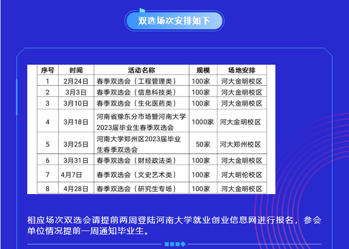 學校擬于2023年3月18日在河南大學金明校區舉辦“引航”春招季——河南省豫東分市場暨河南大學2023屆畢業生春季雙選會,請登錄學校“就業創業信息網”查閱相關邀請函。