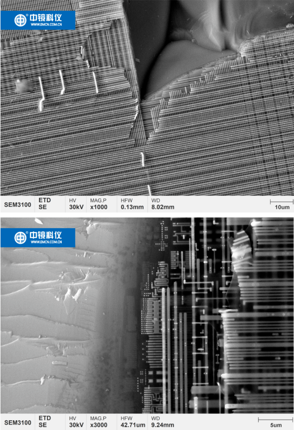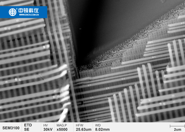 近日,國內(nèi)芯片行業(yè)喜報(bào)連連,8月29日,華為搭載麒麟9000S芯片的Mate 60 Pro正式上線,該芯片上行峰值網(wǎng)速可以達(dá)到5G標(biāo)準(zhǔn)。標(biāo)志著華為突破1079天封鎖!麒麟芯片正式回歸。8月30日中國移動(dòng)宣布,國內(nèi)首款商用可重構(gòu)5G射頻收發(fā)芯片“破風(fēng)8676”研制成功。 電子顯微鏡被廣泛應(yīng)用于芯片設(shè)計(jì)、制造和分析,芯片設(shè)計(jì)者可以通過SEM深入了解芯片內(nèi)部結(jié)構(gòu),優(yōu)化電路布局和排線方式,提高電路的性能和功耗比,觀察和分析微小缺陷和結(jié)構(gòu)變化從而有效提高了芯片的可靠性和穩(wěn)定性,為芯片研發(fā)人員提供了重要的數(shù)據(jù)支持。 下面我們就隨著電子顯微鏡的視野走進(jìn)納米尺度下芯片的世界: 本次選取了Intel奔騰4524(90nm制程)和Intel奔騰雙核E6600(45nm制程)和晶圓,利用掃描電子顯微鏡(SEM)進(jìn)行了觀察。 首先,晶圓放大50倍后,可以看到整整齊齊地排列著數(shù)不盡器件和導(dǎo)線就像一座星羅密布的城池里面縱橫交錯(cuò)的街道。 晶圓放大1000倍,可以看到一個(gè)個(gè)器件整齊排列,正如城池內(nèi)一個(gè)個(gè)建筑物。 cpu芯片放大了1000倍和3000倍,可以看到內(nèi)部的導(dǎo)線整齊地排列,像一條條復(fù)雜的高架橋,連接cpu內(nèi)各個(gè)部件。 放大5000倍,可以看到cpu芯片內(nèi)部有多個(gè)分層,而且每層連線的線徑、間距、走向均不一致,隨著層數(shù)越深線徑、間距越小。 放大到10000倍,可以看到最下層的部件,對比這兩款cpu,可以明顯看出Intel奔騰雙核E6600比Intel奔騰4524精細(xì)得多,經(jīng)過測量,分別為47納米和95nm,與制程參數(shù)基本一致。 芯片被譽(yù)為是人類智慧的“結(jié)晶”,看起來很小,但內(nèi)部結(jié)構(gòu)極為復(fù)雜,對于人類的各個(gè)方面生活都有著深遠(yuǎn)的影響和價(jià)值,電子顯微鏡和芯片一樣,同屬于“卡脖子”技術(shù),此次芯片的突破為我們注入一劑強(qiáng)力劑,只要我們牢牢抓住科技創(chuàng)新的“牛鼻子”,相信在不遠(yuǎn)的將來,“卡脖子”技術(shù)將被我們一一突破。 回頭望,中國芯道阻且長終破浪, 往前看,電鏡夢行而不輟看東方。 編寫:趙勝藍(lán) 攝影:郭 珊 制作:李慧芳 審核:王 萍 校對:李鳳麗、殷 雪