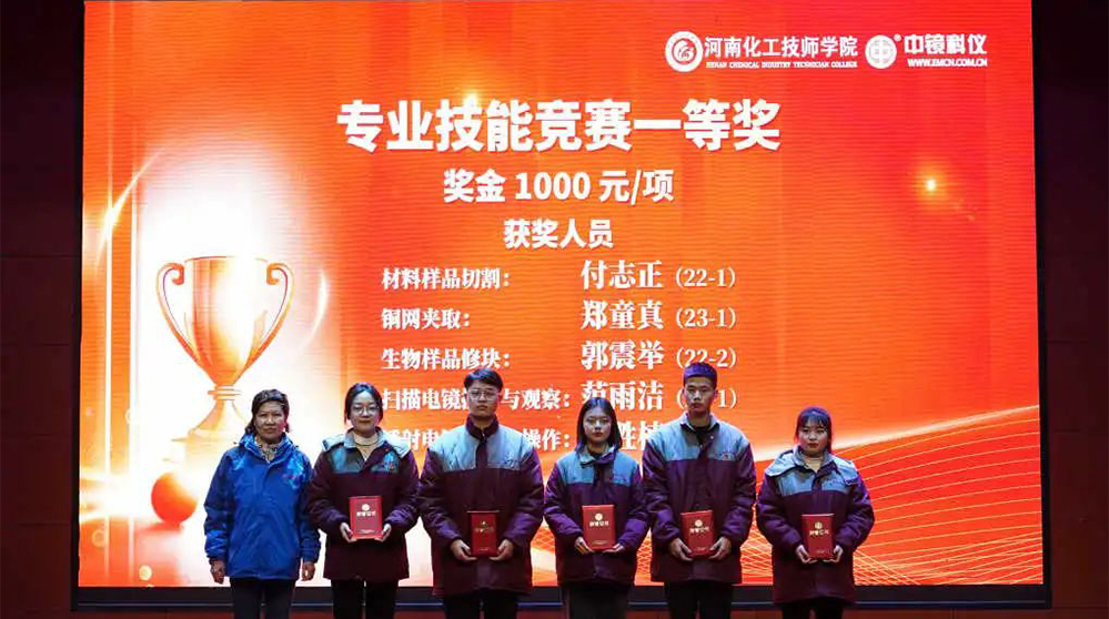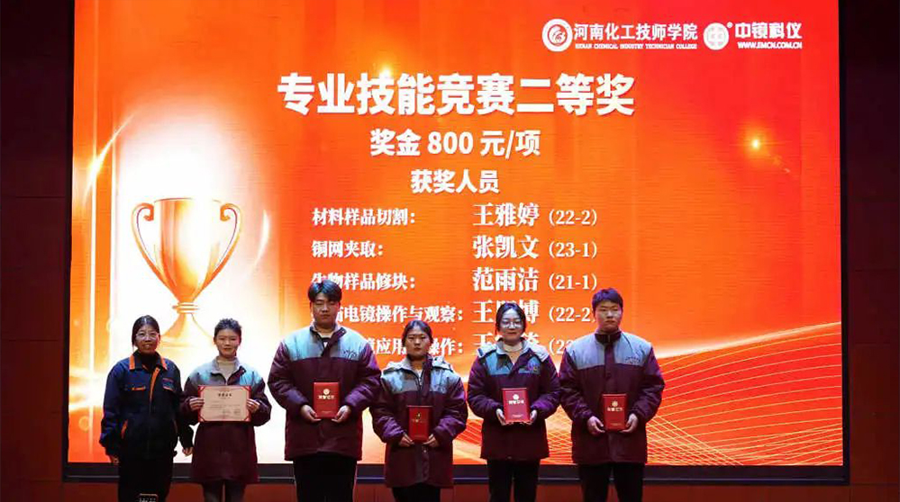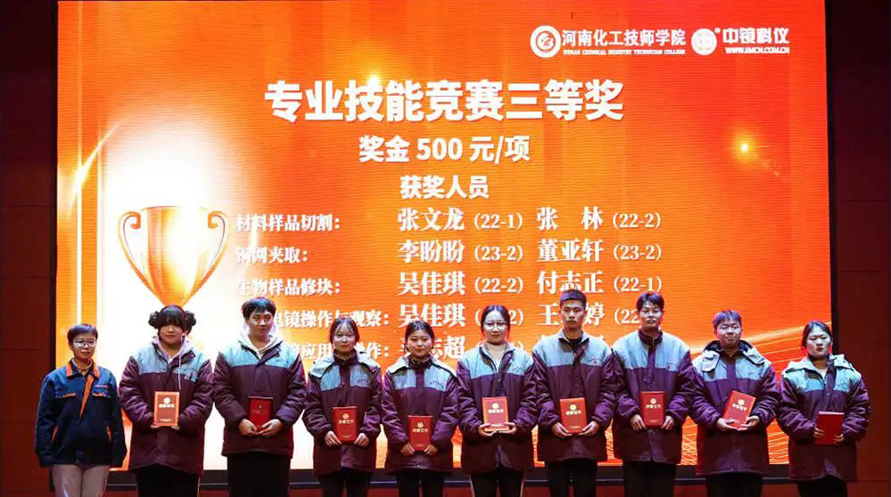 中鏡科儀集團(tuán) 為學(xué)科競賽獲獎學(xué)生頒發(fā)獎金 深化校企合作,助力培育人才 競賽前期,各專業(yè)教研室及任課老師精心組織,認(rèn)真準(zhǔn)備,無論是制定評分標(biāo)準(zhǔn),準(zhǔn)備儀器、試劑和耗材,還是組織學(xué)生選拔考核,每一項(xiàng)工作都一絲不茍,力求做到精益求精。 競賽過程中,裁判老師認(rèn)真執(zhí)裁,公平公正,選手們專心致志,無論在理論還是實(shí)操環(huán)節(jié),都展現(xiàn)出了實(shí)驗(yàn)技術(shù)學(xué)院學(xué)生的專業(yè)風(fēng)采。 經(jīng)過緊張激烈的角逐,本次競賽月活動圓滿結(jié)束。根據(jù)獎項(xiàng)設(shè)置比例,共評出一等獎13人,二等獎20人,三等獎30人。 為激勵更多莘莘學(xué)子奮發(fā)進(jìn)取。在中鏡科儀集團(tuán)2023年度表彰大會暨2024年新年聯(lián)歡會中,中鏡科儀集團(tuán)校企合作負(fù)責(zé)人董保杰和實(shí)驗(yàn)技術(shù)學(xué)院院長魏葆婷共同為電鏡專業(yè)獲獎學(xué)生頒發(fā)獲獎證書和獎金。 專業(yè)技能競賽頒獎現(xiàn)場 通過此次技能競賽月活動,不僅加強(qiáng)了學(xué)生對知識的掌握,也提升了同學(xué)們的專業(yè)技能水平,同時能夠增強(qiáng)學(xué)生對專業(yè)的認(rèn)可度,培育技能學(xué)習(xí)的熱情,充分展現(xiàn)實(shí)驗(yàn)技術(shù)學(xué)院學(xué)生精益求精的工匠精神。 中鏡科儀將攜手河南化院,在人才培養(yǎng)、科技創(chuàng)新、成果轉(zhuǎn)化、產(chǎn)教融合等方面繼續(xù)加強(qiáng)合作,深耕育訓(xùn)結(jié)合,培養(yǎng)出更多“品質(zhì)優(yōu)秀、技能卓越”的電鏡人才,為電鏡行業(yè)發(fā)展貢獻(xiàn)力量。為進(jìn)一步提高學(xué)生的技能素質(zhì),增強(qiáng)學(xué)生的動手能力,形成以賽促教、以賽促學(xué)的學(xué)習(xí)氛圍,實(shí)驗(yàn)技術(shù)學(xué)院于2023年12月開展了為期一個月的技能競賽月。