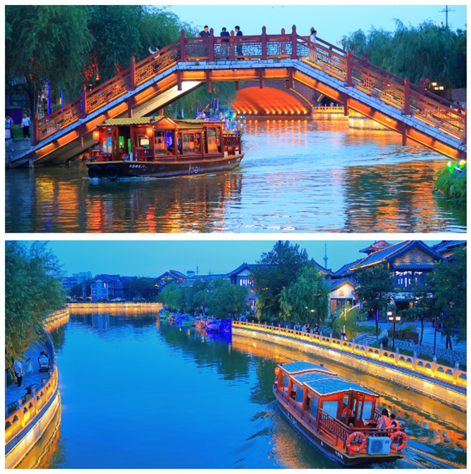 華燈映水,畫舫凌波。槳聲燈影里,人在畫中游。這美麗的畫面就定格在開封大宋御河。入夜,御河兩岸美景升級,坐上游船泛舟湖上,亭榭樓臺、勾欄瓦肆,美輪美奐。