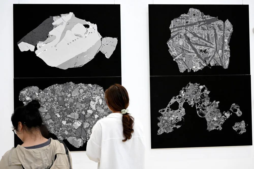 2023年4月19日,觀眾在《閱壤——月壤科研成果主題藝術展》展覽上,觀看月壤顆粒掃描電子顯微鏡背散射全景照片。新華社記者 黃博涵 攝